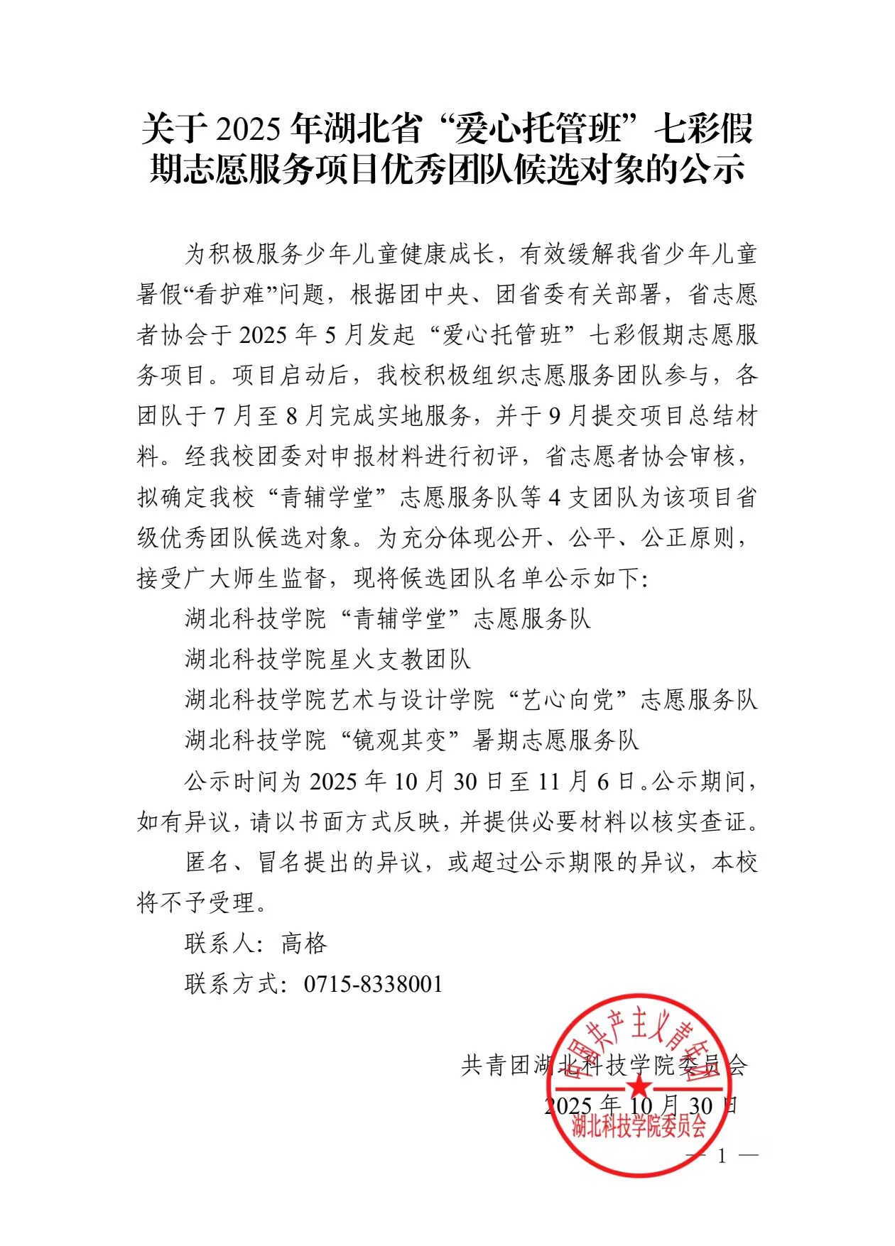 关于2025年湖北省“爱心托管班”七彩假期志愿服务项目优秀团队候选对象的公示