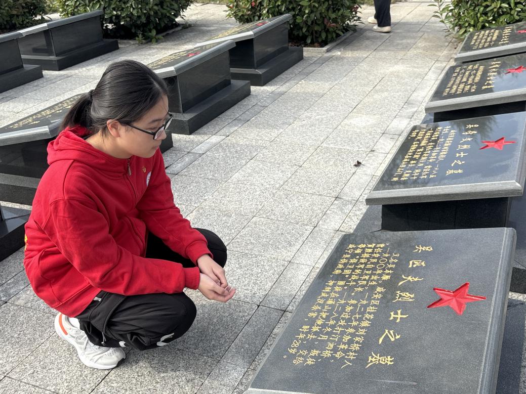 随后,同学们有序走进烈士墓区。面对整齐排列的墓碑,大家自发驻足凝视,轻声诵读烈士姓名,以静默表达对英烈的崇高敬意。不少同学表示,这样的实地教育让历史不再遥远,信仰更加坚定。
