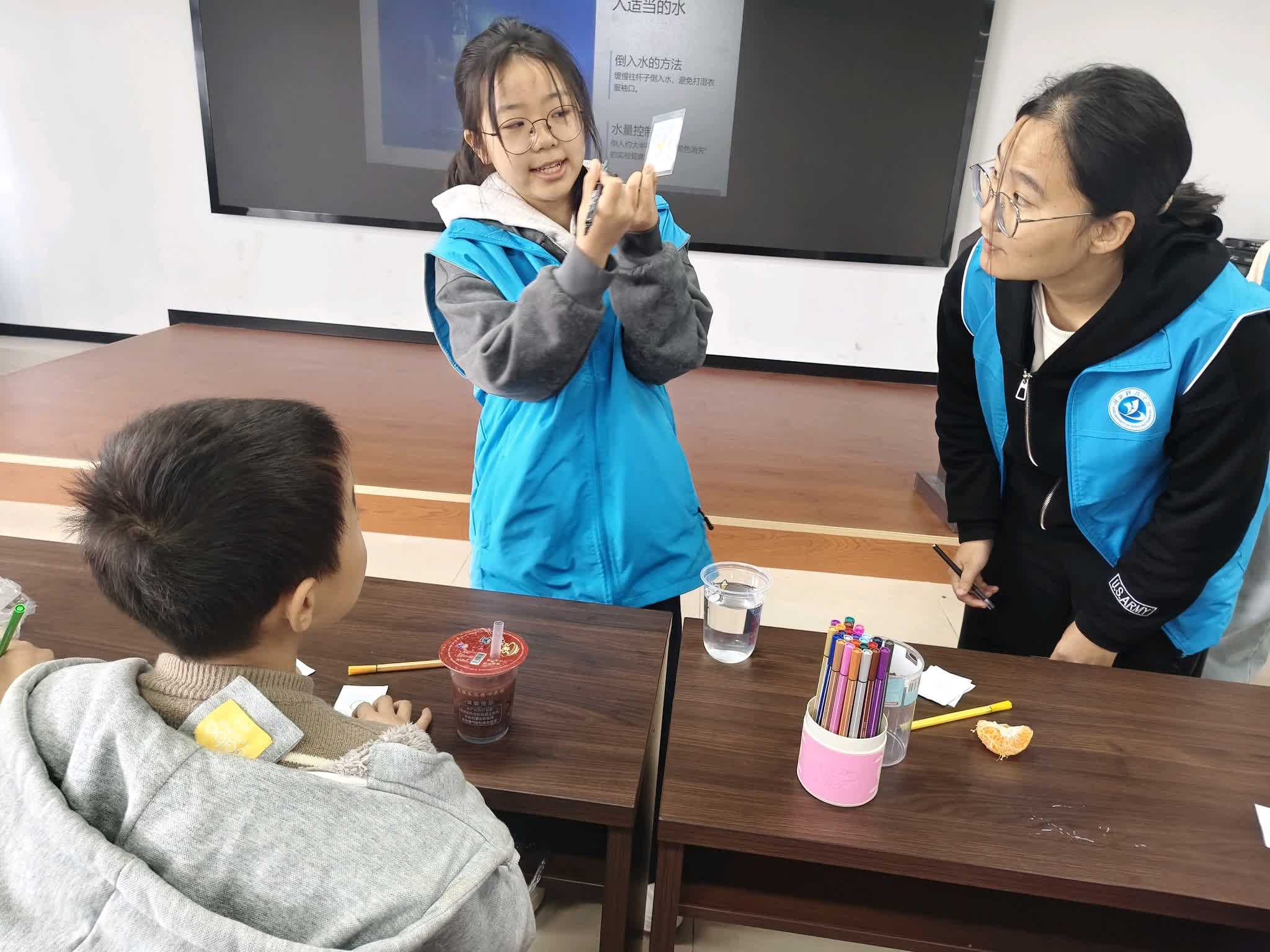 在“消失的颜色”主题课堂上,志愿者们以实验为媒,引导孩子们在动手操作中初探化学与光学的奥秘。从亲手准备到实验观察,孩子们在色彩变幻中感受科学的神奇,也在实践中提升了动手能力与解决问题的信心。课堂摒弃单向灌输,强调协作与互动,让孩子们在动手中学原理、在提问中启思考,手、眼、耳、脑并用,让化学的种子悄然生根。在“生活中的消失魔法”拓展环节中,志愿者们带领孩子们回顾课堂所学,更鼓励他们将科学原理与日常生活相联系,让看似遥远的科学变得触手可及。从实验操作到生活理解,课堂层层递进,在启发观察与联想的同时,也悄然培养起孩子们的总结与迁移能力。